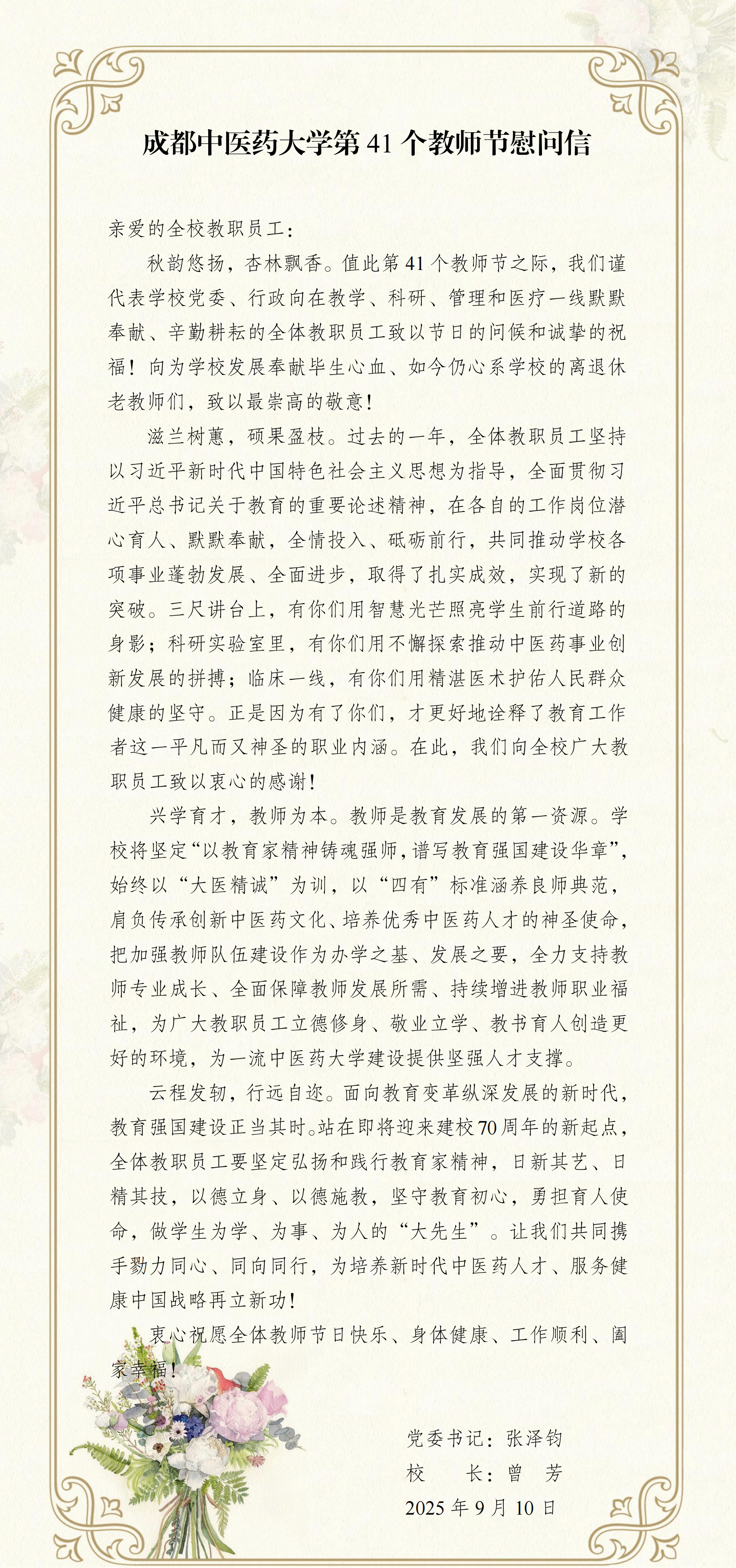 beat365在线唯一官网第41个教师节慰问信 发布时间:2025-09-10 14:51:04 浏览次数: 次 【字体:小 大】 【打印正文】 下一条:没有了! 下一条:beat365隆重举行2025级新生开学典礼