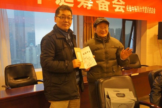 筹备会上,beat36556级校友、80高龄的马有度教授捐赠自编专著《感悟中医》向母校60华诞献礼,余曙光代表学校接受了捐赠。自此,重庆校友会拉开了庆祝母校60华诞的序幕。