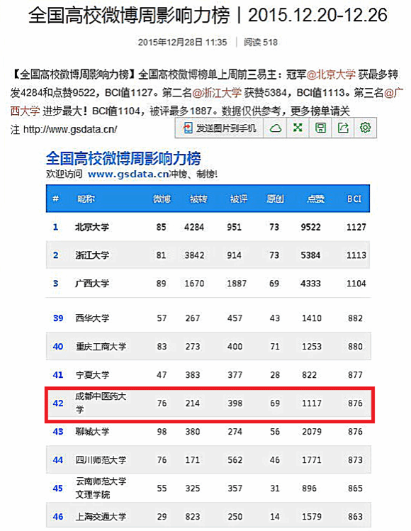 学校官方微博在全国高校微博周影响力榜中位居42名(2015.12.20-12.26) 发布时间:2015-12-28 15:19:00 浏览次数: 次 【字体:小 大】 学校开通官方微博以来,共设置各类话题109个,发布微博3712条,开展线上线下活动9次,粉丝达到10315。在各类影响力排行榜中,有20次进入全国高校微博周影响力排行榜百强,8次进入全国高校微博周影响力排行榜前50名,1次进入全国高校微博周影响力排行榜前20名,14次进入全国医学院院校微博周影响力排行榜前3名且有5次位居首位。 (编辑/任翔) 【打印正文】 上一条:学校召开2015年度学校党委书记抓党建工作述职评议大会 下一条:学校官方微博在全国高校微博周影响力榜中位居42名(2015.12.20-12.26)
