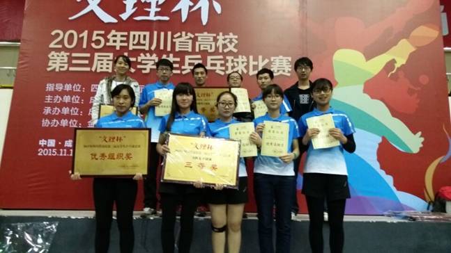 2015年四川省第三届高校大学生乒乓球比赛于11月14日至15日在成都文理学院举行,来自四川大学、电子科技大学、西南交通大学、西华大学、四川师范大学、西南石油大学、西华师范大学等36所高校近400名运动员参加比赛。beat365乒乓球代表队10名运动员参加比赛,药学院陈栩夺得女子单打第5名,第二临床医学院余潇、体育学院宋城、莫桓、李宣运以及临床医学院叶广获得男子团体三等奖,来自管理学院的胥喜梅、第二临床医学院贺婉林、临床医学院梁雨晴、药学院陈栩、体育学院刘菊获得女子团体三等奖。体育学院教师陈远莉获