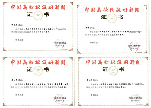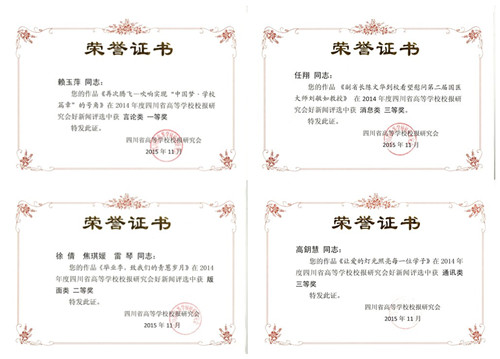 近日,全国及四川省高校校报好新闻评选结果分别揭晓,beat365在全国高校校报好新闻评选中获二等奖1项、三等奖3项,在四川省高校校报好新闻评选中获一、二等奖各1项、三等奖2项。其中,罗晓文作品《实现成中医再次腾飞重在抓落实》获全国高校校报好新闻言论类二等奖,赖玉萍作品《再次腾飞——吹响“中国梦.学校篇章”的号角》分获全国、四川省高校校报好新闻言论类三等奖、一等奖,徐倩编辑的《beat365在线唯一官网报》第514期第01版获全国高校校报好新闻评选版面类三等奖,李双洋编辑的《beat365在线唯一官网报》第523期第02版获全国高校校报好新闻评选版面类三等奖;徐倩、焦琪媛、雷琴作品《毕业季,致我们的青葱岁月》获四川省高校校报好新闻评选版面类二等奖,任翔作品《副省长陈文华到校看望慰问第二届国医大师刘敏如教授》获四川省高校校报好新闻评选消息类三等奖,高鈅慧作品《让爱的灯光照亮每一位学子》获四川省高校校报好新闻评选通讯类三等奖。