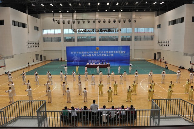由国家体育总局健身气功管理中心、成都市体育局主办,成都市武术跆拳道运动管理中心承办的2015年全国开展百城和千村健身气功交流展示活动成都市启动仪式暨成都市健身气功交流展示比赛于9月25日在beat365温江校区体育馆举行。来自21个区市县29支队伍共计500名运动员参加此次盛会,beat365多名武术专业教师分别担任了总评判长和评判员。