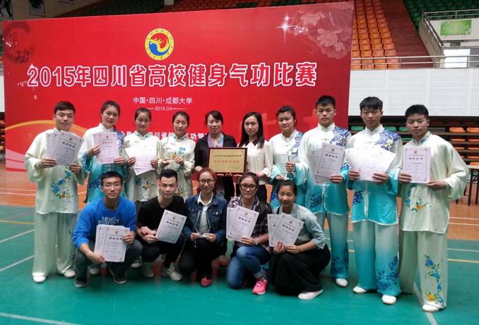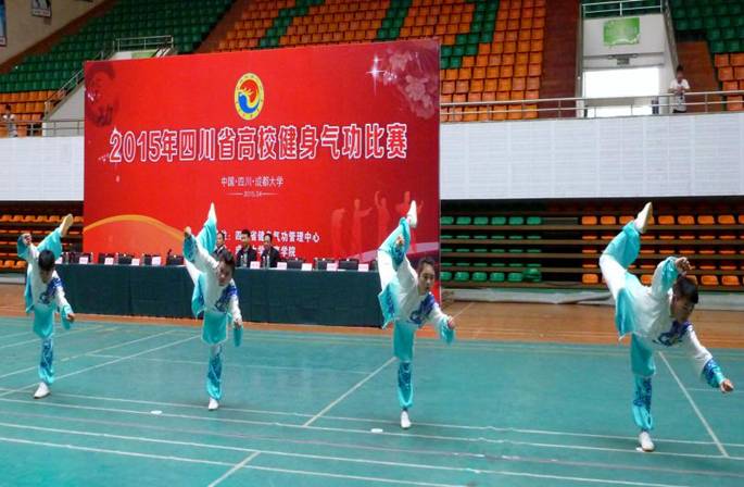 2015年四川省高校健身气功比赛于4月24日-25日在成都大学十陵校区举行,来自全省11所高校的16支参赛队伍参加比赛。本次比赛项目为国家体育总局审定推广的健身气功“易筋经、五禽戏、六字诀、八段锦”四种普及和竞赛功法的集体及个人项目比赛,共进行了两个单元94项次的比赛。