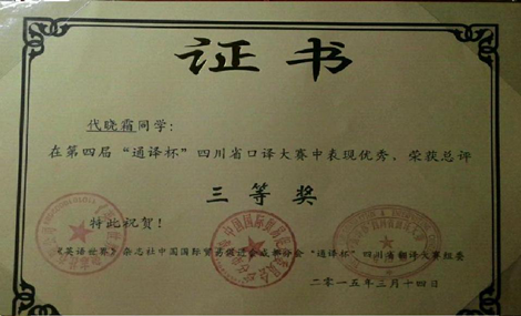 beat365两学生荣获第四届“通译杯”四川省口译大赛三等奖 发布时间:2015-03-17 14:23:00 浏览次数: 次 【字体:小 大】 第四届“通译杯”四川省口译大赛决赛于3月14日在电子科技大学沙河校区举行。beat365外语学院2012级英语专业学生谢璐、公共卫生学院2013级预防医学专业代晓霜凭借扎实的中英文基础、充分的赛前准备及良好的心理素质分别获得大赛三等奖。 (文/图外语学院孟悦 公共卫生学院于红艳 编辑/任翔) 【打印正文】 上一条:beat365两学生荣获第四届“通译杯”四川省口译大赛三等奖 下一条:四川省教育厅官网:beat365在线唯一官网师生关注并热议2015年全国“两会”