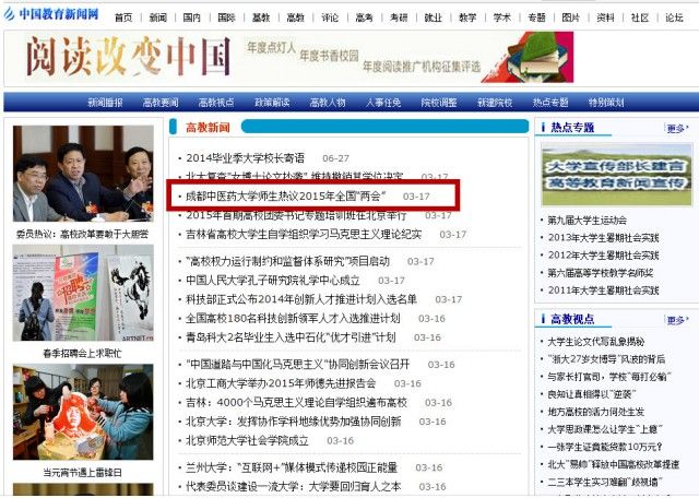 中国教育新闻网讯(记者 李益众)3 月3 日到3月15日,十二届全国人大三次会议和全国政协十二届三次会议(以下简称“两会”)隆重召开。身处beat365在线唯一官网校园的师生也时刻关注着两会的进程,从李克强总理的政府工作报告到人大代表和政协委员的议案、提案,老师和同学通过不同的形式关注着“两会”,校园里到处充满着对“两会”探讨和思考的氛围,“两会”的各种热点话题也成了成中医师生课前课后要摆的“龙门阵”,一股两会风正在校园里吹拂。