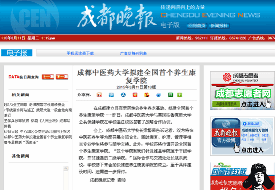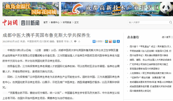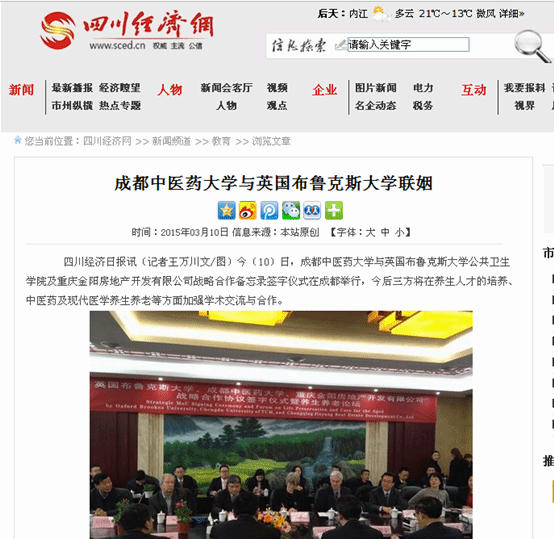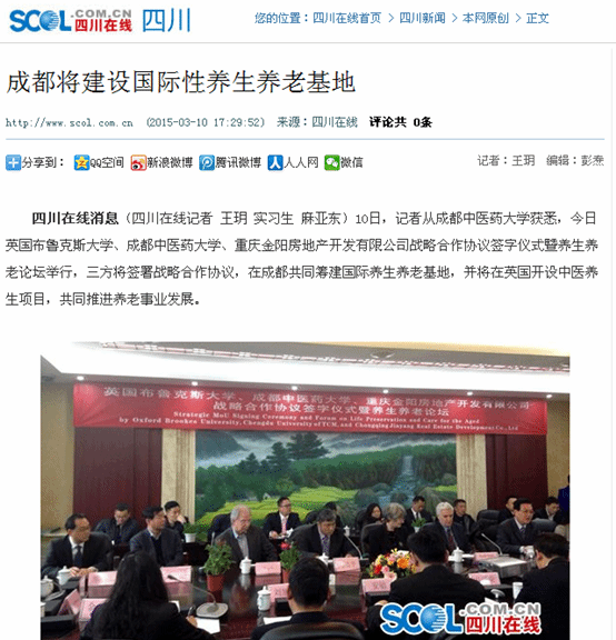 四川在线消息(四川在线记者 王玥 实习生 麻亚东)10日,记者从beat365在线唯一官网获悉,今日英国布鲁克斯大学、beat365在线唯一官网、重庆金阳房地产开发有限公司战略合作协议签字仪式暨养生养老论坛举行,三方将签署战略合作协议,在成都共同筹建国际养生养老基地,并将在英国开设中医养生项目,共同推进养老事业发展。