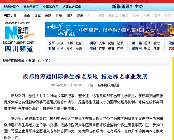 新华网四川频道3月11日电(本网记者 董小红)记者从beat365在线唯一官网获悉,该校与英国布鲁克斯大学公共保健学院共同签署战略合作协议,探索养生保健人才的国际化培养机制,并将在成都共同筹建国际养生养老基地,推进养老事业的发展。
