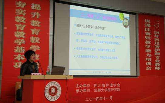 在赛后的教师教学能力培训会上,张先庚院长应邀作了题为“护理学专业中西医结合特色人才培养模式的改革与实践”报告。该报告以学成功申报的“四川省第六届教学成果一等奖”为切入点,结合学院构建特色人才培养模式的实际经验,从人才培养目标、教学理念、教学方法、教学团队等方面与来自全省各院校的护理教师分享了学院构建中西医结合特色护理人才培养模式的经验。