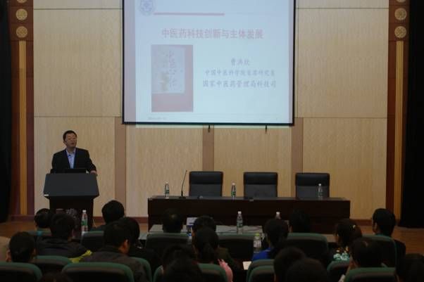 曹洪欣教授介绍了中医药科技创新发展现状,阐述了现行国家中医药科技计划专项及基金体系,倡导发扬中医特色优势、提高自主协同创新能力与防治疾病能力,全面可持续的发展中医药。王喜军教授介绍了在建立中药血清药物化学研究方法的基础上,整合代谢组学的理念和技术,开展中医证候和方剂整体疗效评价及药效物质基础研究,建立方证代谢组学的研究方法和技术体系。曹洪欣教授和王喜军教授精彩的报告使参会师生深受启发,讲座气氛热烈,反响良好。