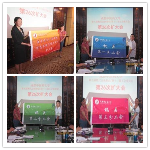 会议举行了新成立分工会的授旗仪式,傅春华为新成立的医学信息工程学院分工会,机关第一、二、三分工会授旗。
