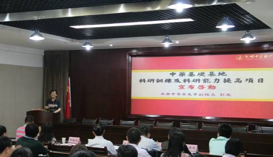 国家基础科学人才培养基金中药基础基地科研训练及科研能力提高项目由彭成担任总负责人,23位校内外中药学领域知名专家为子课题负责人,获批经费400万元,用于中药学基础基地班本科生科研创新能力的训练和提高。项目以“医药结合、系统中药、实践创新”的教学理念训练学生科研思维,构建“一中心两阶段三层次”实践教学体系训练学生基本科研技能,“抓系统,重素质”集中训练学生科研综合素养,“彰特质,重个性”分散训练学生科研创新能力,培养中药学科基础扎实、综合素质高、创新能力强的科研创新人才。