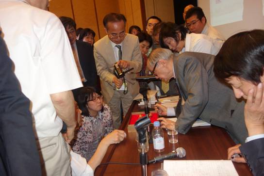 三场精彩的报告吸引了日本各地中医药学者、专家近百人参会,引发了对《伤寒论》经方临床应用规律的热烈讨论。尽管会场上时间一延再延,日本学者仍感意犹未尽,会后木本裕由纪组织部分学者逐一向郭老请教,他们都谈到本次交流会受益匪浅,小柴胡汤、四逆散、桂枝汤等也是他们在临床常用的方剂,学术报告的内容非常实在,条分缕析地总结了方证的应用规律,大有醍醐灌顶之感,热切地希望这样的交流活动继续开展。郭老还将中国产的野山参带到会场,详细讲解了人参的鉴别、服法及其在经方中的应用,更是被参会代表围得水泄不通。