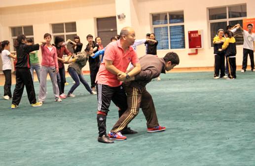 就如何提高紧急情况下防身技能,邬建卫现场演示讲解了在实力相当、实力悬殊和被对方控制等情况下的处理方式,以及报警、逃避、防守、进攻的重点与技巧。邬教授还向同学们传授了实用的基本散打拳法、腿法技术动作,学生训练认真,气氛热烈,效果明显。他要求同学们平时要加强身体素质训练,结合防范技巧,在关键时刻保护自己。邬建卫教授是全国大学生民族传统体育协会常务理事、全国中医药院校传统保健体育研究会常务理事、四川省大学生武术队总教练、beat365在线唯一官网武术队总教练。