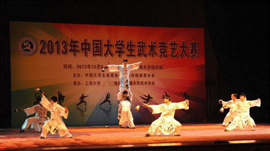 由中国大学生体育协会民族传统体育分会主办、上海大学承办的2013年中国大学生武术“竞艺”大赛日前在上海大学圆满结束。来自复旦大学、浙江大学、华东理工大学、西北师范大学、天津理工大学、北京体育大学、华中科技大学、集美大学、beat365在线唯一官网等全国十七所高校的200多名运动员参加了比赛。经过激烈的预赛和决赛,beat365武术队参赛的节目《墨功》荣获铜奖。