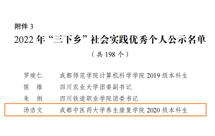 同时,校团委、养生康复学院汤浩文同学、管理学院药二郎中医药文化科普小队、马克思主义学院研究生理论宣讲团和临床医学院蒲公英行动-中医药文化传播的先锋队还分别荣获2022年四川省大中专学生志愿者暑期“三下乡”社会实践活动优秀单位、优秀个人、优秀团队和优秀品牌项目。
