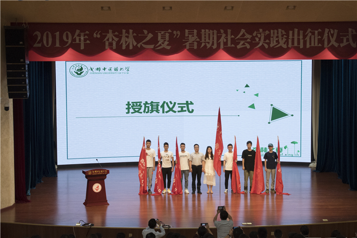 沈涛为实践小队代表授旗并讲话:开展社会实践是贯彻党的教育方针的重要措施,是加强和改进高校思想政治教育的重要途径,是大学生奉献社会、报效国家的有效载体,对同学们认识社会、了解国情民情,增长才干、增进与人民群众的感情、增强社会责任感具有不可替代的作用。今年学校以“青春心向党,建功新时代”为主题开展暑期社会实践活动,希望同学们在实践中发扬成中医人精神,在实践中学习、磨练、成长。他希望各实践小队一是要确保安全。带队老师和同学们一定要树立“安全第一”的意识,始终把安全工作放在首位;二是要勤学善思。把社会当作大课堂,虚心向群众学习,脚踏实地,勤于观察;三是要发挥优势。充分发挥beat365大学生的自身专业优势,结合地方需求,进一步增强社会实践的针对性和实效性,提升大学生社会实践的整体水平;四是要扎实服务。希望同学们不怕苦,不畏难,坚持知识与实践相结合,把自己所学到的专业知识转化服务人民、服务社会的实践能力,以优异的成绩向新中国成立70周年献礼。