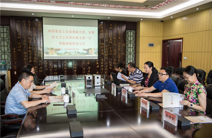 6月5日上午,省总工会副主席苗勇、省教科文卫工会主席李长春一行到校考察调研学校工会工作。