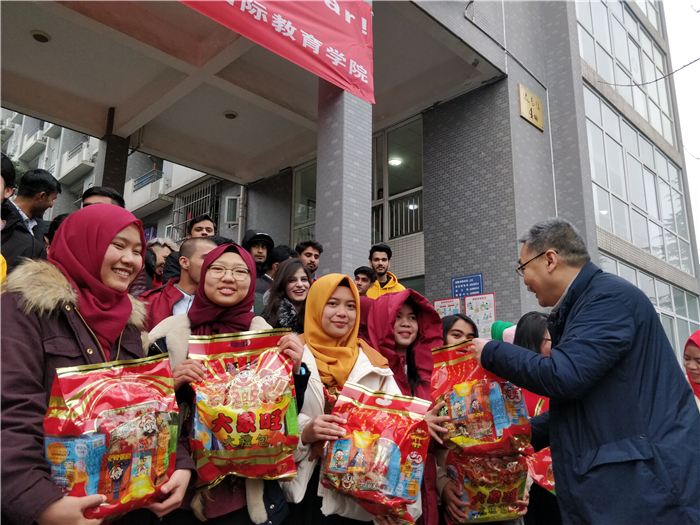 2019年1月18日上午,校长余曙光、学生处处长叶军与国际教育学院领导和老师们,一起在beat365温江校区4公寓,看望留校的留学生们,并为他们提前送上节日的问候和新春的祝福。