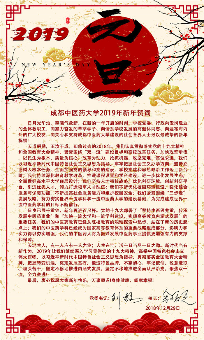 2019年新年贺词 发布时间:2018-12-29 23:54:00 浏览次数: 次 【字体:小 大】 【打印正文】 上一条:2018—2022年教育部高等学校中医学 中西医结合类专业教学指导委员会成立 下一条:beat365第二届国际生物医药与中医药青年论坛开幕