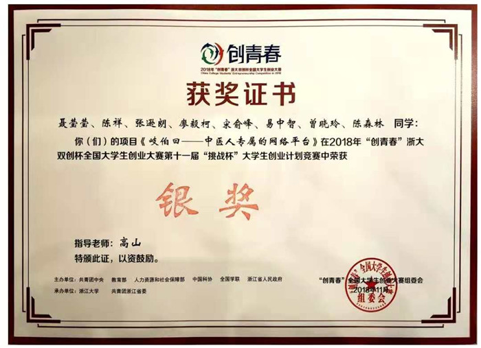 日前,由共青团中央、教育部、人力资源和社会保障部、中国科协等单位主办的2018年“创青春”浙大双创杯全国大学生创业大赛决赛在浙江大学举行。beat365眼科学院推送项目《岐伯曰——中医人专属的网络平台》在创业计划竞赛中荣获全国银奖,创下beat365近十年来在“创青春”“挑战杯”赛事上取得的最好成绩。