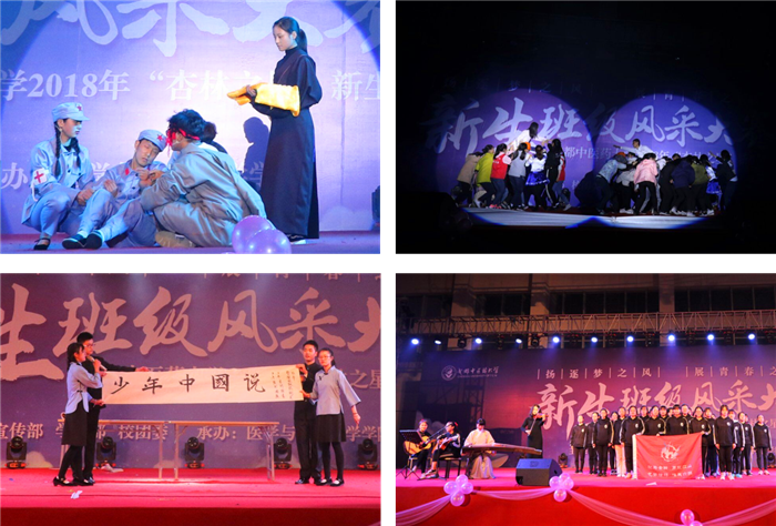 各学院推选出的新生班级为大家带来了形式各异、精彩绝伦的表演。公共卫生学院的《舞出我班风》以多种舞蹈展示了他们的青春洋溢;临床医学院的《少年中国》将鼓声融入朗诵、武术、舞蹈中,极具中国风;外语学院的《恋Dance》借经典剧和热剧的人物情节展现了日语班可爱有趣的一面;针灸推拿学院的《青春不负少年时》采用了武术、师生共舞、打篮球等多种形式展现班级风采;养生康复学院的《杏林养生,舞动青春》将表演与热曲《成都》的歌词融会贯通;医学技术学院的《静水流深,沧笙踏歌》通过古筝的乐律带我们走进民国时期,领略少年风光;医学与生命科学学院的《雨夜白衣》为我们讲述了医生在雨夜中救助孕妇的动人故事,阵阵哀嚎,声声啼哭,无不拨动着观众的心弦;护理学院的《青春路上不迷茫,让我留在你身边》以上课问答的形式展现了班风班貌;民族医药学院的《红色草原情》从红军翻过雪山被藏医救助到藏区人民为红军献上哈达都透露出民族特有的韵味。