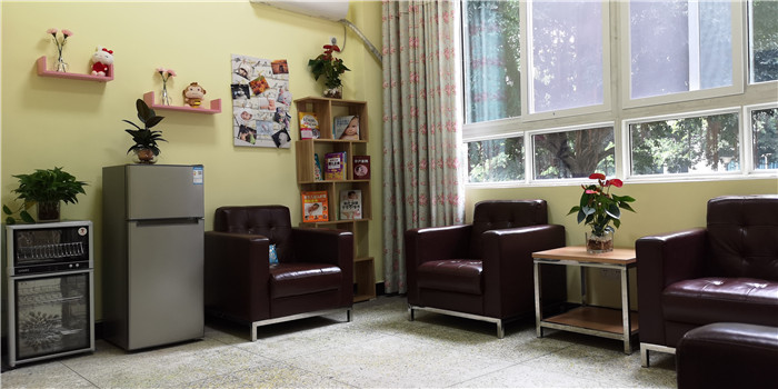 这是由学校后勤基建处与校工会联合打造的母婴室。室内配备了冰箱、消毒柜等设施为母乳的储存提供安全保障,舒适的座椅、贴心的图书,空调,热饮,甚至连窗帘、画框、盆栽、小摆件等都是精心挑选,温馨淡雅,充满童趣的室内环境让人顿感温馨,将为职场妈妈送上贴心服务。