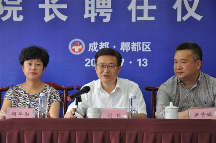 刘毅与郫都区卫计局局党委书记、局长阚华勋为李钰颁发院长聘书。李钰作表态发言,表示有能力、有决心、有信心带领医院迈上发展新台阶。
