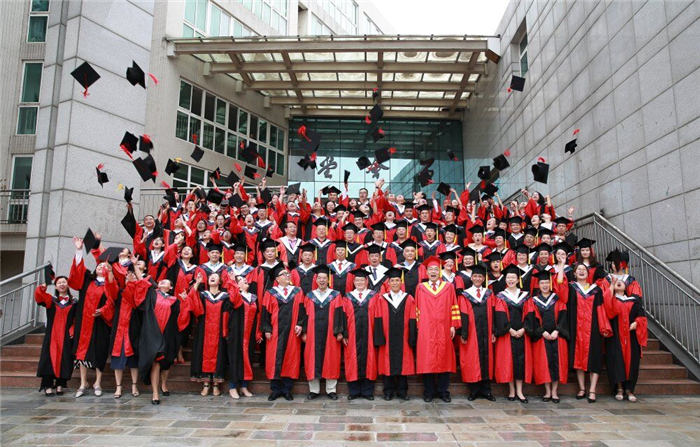 在欢快的拉德斯基进行曲中,余曙光为72名博士学位获得者拨正流苏,并合影留念。
