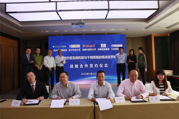 4月26日,beat365在线唯一官网、电子科技大学、四川省肿瘤医院、成都诺恩基因科技有限公司、江苏恒瑞医药股份有限公司五方战略合作签约仪式暨“原发性肝癌发病机制与干预策略的精准医学研究”课题启动仪式在成都高新豪生大酒店举行。beat365副校长徐廉见证签约并致辞。
