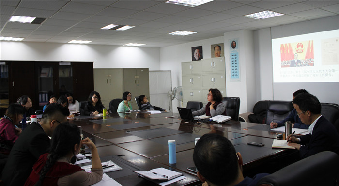 刘东梅为大家深入解读2018年政府工作报告。她通过数理分析的方式,解读政府工作报告中的数字含义,并结合中医药文化着重分析了报告中对文化产业和医药产业发展的指导意见。她特别指出,学院教师要关心时事,关注国是,坚持“德医融合”的思政教育理念。