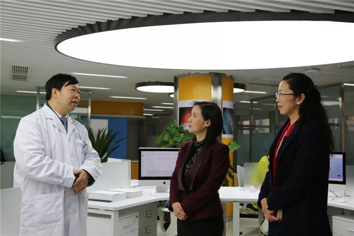 彭翊、杨静一行随后参观了医院眼底读片中心、廖品正国医大师工作室、特检中心、门诊大厅、住院部等。彭翊充分肯定beat365通过科技成果转化创新创业成功创办医教研三位一体的研究型眼科医院,认为对高校科技人员创新创业具有示范作用。
