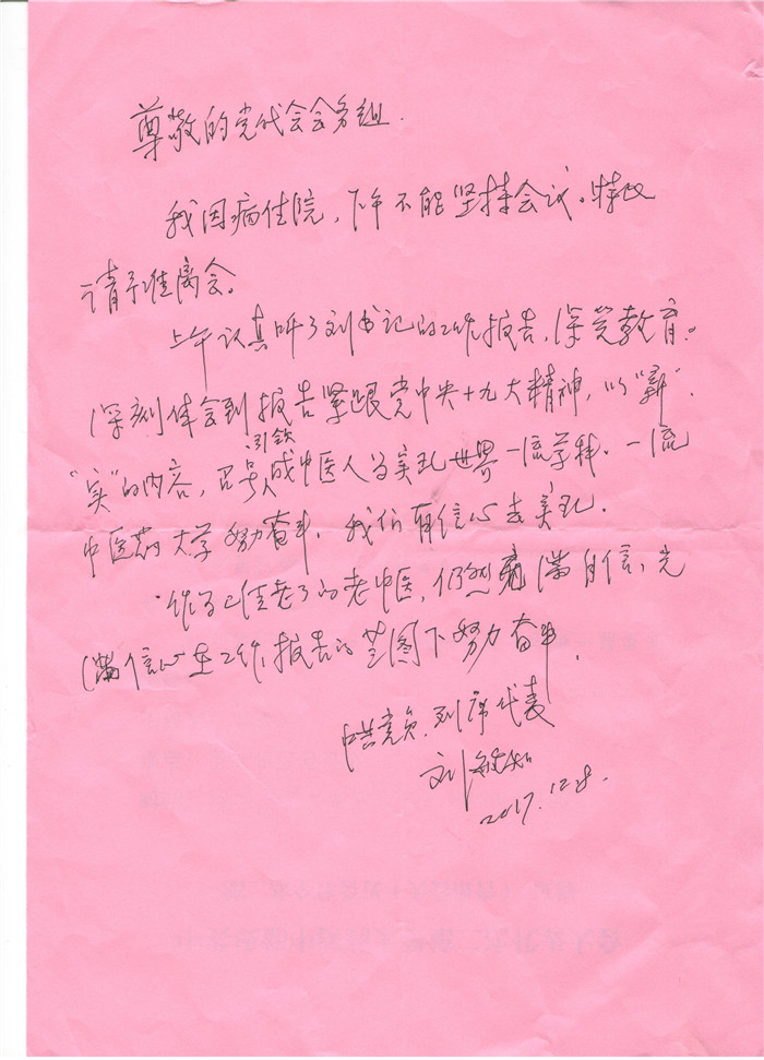 听完报告后,刘敏如感到非常振奋和激动,但又因身体小恙不能参加分团讨论而遗憾。她专门郑重写下请假条,并亲自将它交到党委书记刘毅手中。嗓音略显嘶哑但语句坚定有力,她对刘书记说:“报告中描绘的新时代美好蓝图让我很憧憬,我对我们学校事业发展之路也充满信心!”在请假条中,她这样写道