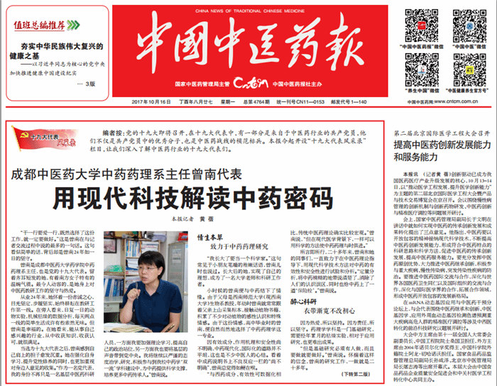 中国共产党第十九次代表大会将于10月18日在北京隆重召开。作为全省23个基层一线代表之一,以及四川省属高校唯一的代表,beat365药学院中药药理系主任曾南教授将随四川团赴京参加本次盛会。这既是曾南教授个人的荣誉,也是学校的荣誉,还是我省高校和中医药行业的荣誉。近日,《中国中医药报》《四川日报》《成都商报》《华西都市报》、新华网、四川新闻网、四川在线等媒体纷纷来校采访曾南教授,于10月14日开始陆续在各媒体十九大专题报道中推出代表风采。