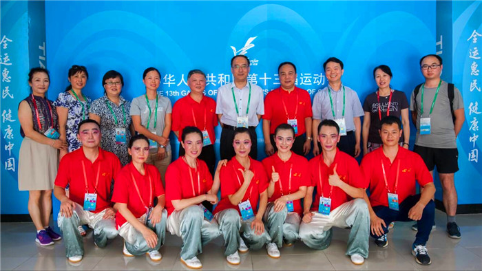 四川代表队共6位队员,在胡剑秋老师带领下,以预赛排名团体总分第三进入决赛。决赛中他们沉着迎战,发挥稳定,不仅获得了多项佳绩,还在第一单元的“易筋经”集体赛中以9.25的高分,夺得本届全运会健身气功比赛的首金。获此消息,四川省体育局副局长温建赛后亲自接见代表队,并合影留念。