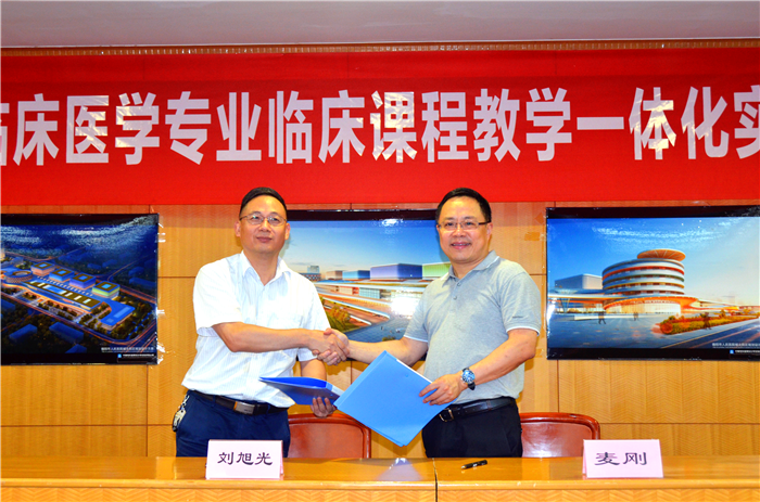 麦刚致欢迎辞并介绍德阳市人民医院概况。刘旭光与麦刚代表双方签订教学合作协议。廖珊对beat365本科生临床理论教学和德阳市人民医院的成功合作表示祝贺并作重要讲话,她认为此举是深化医学教育改革、输送更多优秀医生、推进健康中国的重要举措。