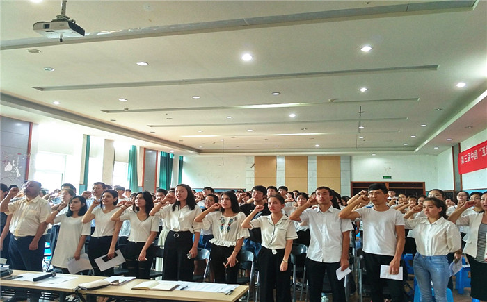 内派维族教师拜合提亚尔带领全体学生宣誓:大力宣传党的各项惠民政策,以自己的亲身经历介绍新疆籍学生在内地成长成才的感人故事,以及各民族学生交往交流交融的鲜活案例,同时把自己在内地学到的新知识、新理念,看到的新气象、新变化传播给身边的人,教育和引导自己的亲朋好友及周边各族群众,坚定地做维护祖国统一和民族团结的促进者、维护者、捍卫者。