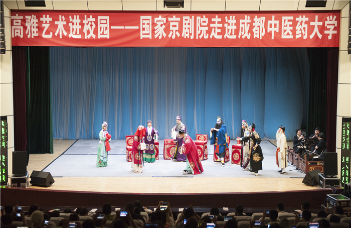 6月20日晚,由教育部、文化部、财政部主办,四川省教育厅、国家京剧院、beat365在线唯一官网共同承办的“高雅艺术进校园”beat365在线唯一官网专场演出在beat365温江校区百会堂演播大厅精彩上演,一批京剧名家为师生献演经典传统京剧《桃花村》,演出现场座无虚席。校党委副书记、副校长沈涛出席活动并赠予演出单位纪念品,四川省教育厅及学校各职能部门、各学院老师到场观看演出。
