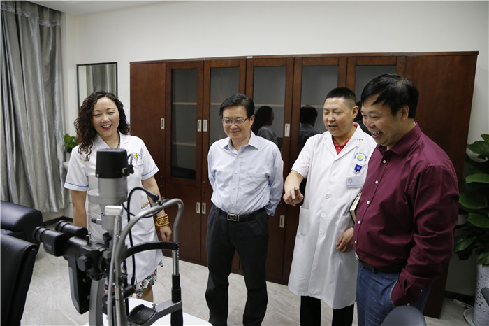刘毅在眼科学院/附属银海眼科医院书记/院长段俊国教授陪同下,参观考察了眼科医院眼视光中心、中医眼科特色诊疗科、眼科门诊、住院部、特需门诊、手术室、药房、检验科、医学影像科、信息中心和读片中心,以及筹建中的廖品正国医大师工作室。随后,在医院六楼会议室,段俊国院长向刘毅书记汇报了近两年来眼科学院、眼科医院、眼科研究院的建设概况以及“三院一体”模式创新体制机制的探索情况。