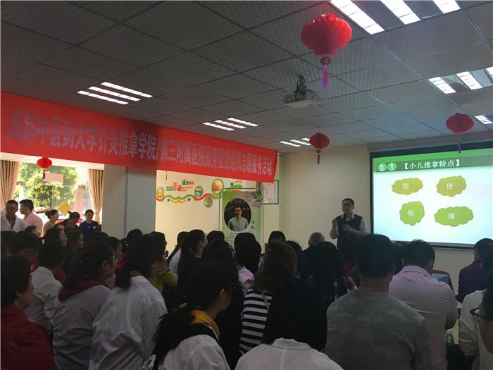 4月15日上午,针灸推拿学院/第三附属医院分党委走进温江区柳城街道燎原社区养老服务中心,开展了服务型党组织志愿服务活动,以“讲座+新市民培育+养生功法+推拿”的形式为社区居民送去健康。小儿推拿学专家冯跃副教授、柳城街道党委王涛、学院/医院副书记杜娟和青年志愿者们参加了本次活动。