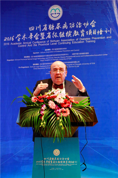 四川省糖尿病防治协会会长、眼科学院院长段俊国教授为开幕式致辞,并做了协会2016年工作总结与未来工作规划,对新成立的糖尿病早期筛查专业委员会和糖尿病健康教育专业委员会表示祝贺。他同时也指出我省糖尿病防控形势严峻,号召省糖尿病协会全体会员要在省卫计委等有关部门的领导下团结全省糖尿病领域医生、护士、营养师、企业家和病人,一道提高我省糖尿病防控的总体水平,降低糖尿病的发病率、致残率和致死率,为“健康中国”和全面实现小康社会做出应有的贡献。