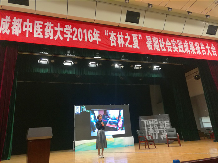 11月17日下午,学校2016年“杏林之夏”暑期社会实践成果报告大会在百会堂演播大厅举行。学生处、校团委、针灸推拿学院、医学技术学院、医学信息工程学院相关领导和老师及得荣县人大常委会主任阿郎出席了报告会。来自各实践小分队的代表及四川农业大学学生代表近400人参加了会议。
