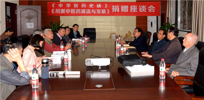 座谈会由彭成副校长主持。两本书的主编杨殿兴教授介绍了主创人员的基本情况和编写情况,总结了《中华医药史话》的四大特点:以史传史;以人代诗;诗书画意墨韵;立足全国、突出四川;阐述了《川派中医药源流与发展》的四个特色:从源到流;既注重人又注重作品;医药并重;填补了多学派的空白。梁繁荣校长代表学校对本次捐赠书籍的校友和编写组成员表达了诚挚的感谢,对两本书的内容给予了高度评价,肯定了这两本书对中医药文化及川派中医药发展的巨大贡献。座谈会上,各编委及主创人员和学校相关职能部门相互交流,提出了许多有利于学校下一步中医药文化建设的意见和建议 。