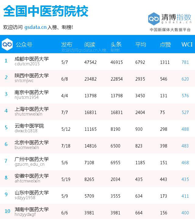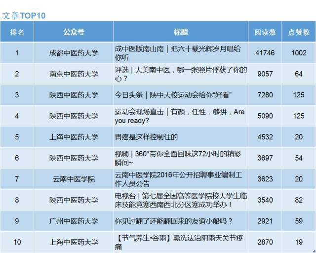 学校官方微信在全国中医药院校微信影响力周榜中位居首位(4.17-4.23) 发布时间:2016-04-28 13:49:00 浏览次数: 次 【字体:小 大】 由学校官方微信公众号推送的《成中医版南山南|把六十载光辉岁月唱给你听》秒杀其他高校文章,以4万多的阅读量傲视了中医药院校微信圈。 (编辑/任翔) 【打印正文】 上一条:学校官方微信在全国中医药院校微信影响力周榜中位居首位(4.17-4.23) 下一条:德国柏林经济与法律学院代表团来校交流访问