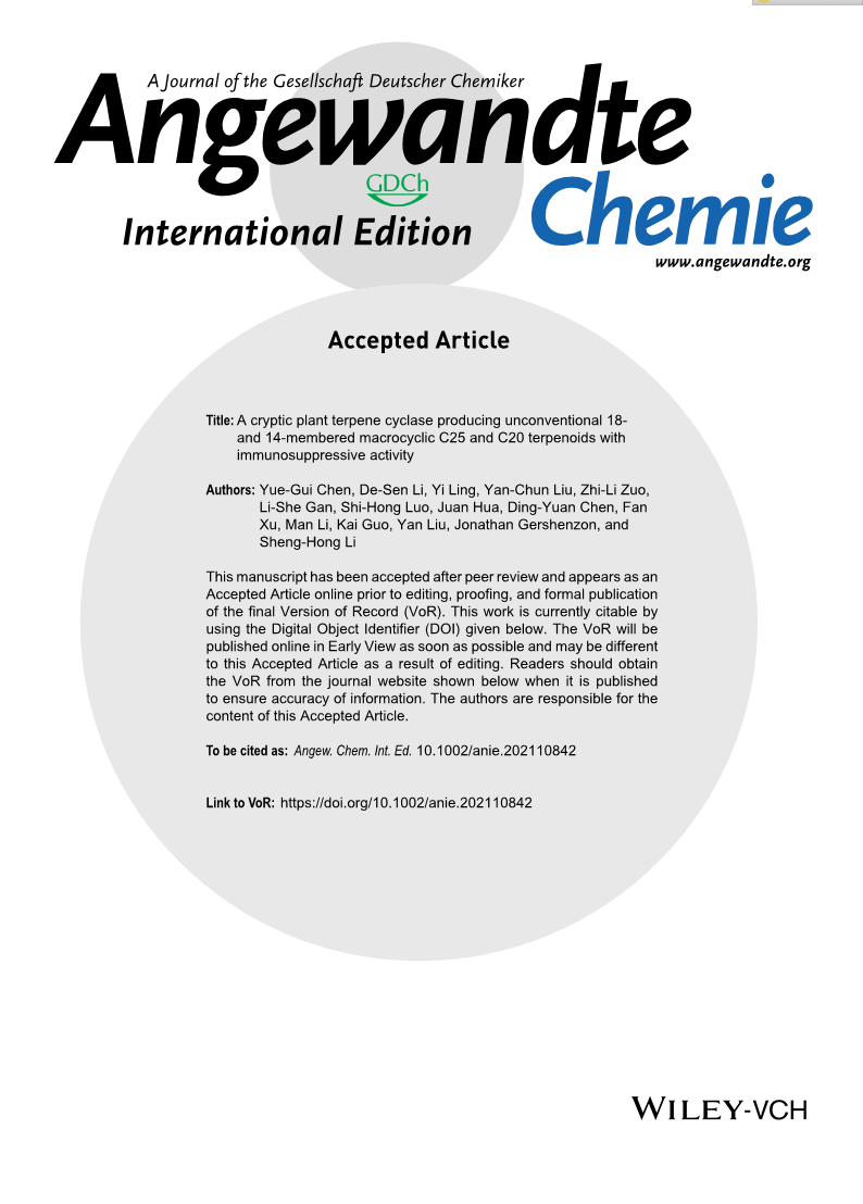 近期,beat365在线唯一官网西南特色中药资源国家重点实验室/中医药创新研究院黎胜红研究团队在国际化学顶级期刊Angewandte Chemie - International Edition(Nature Index,中科院JCR一区)上发表了题为 “A cryptic plant terpene cyclase producing unconventional 18- and 14-membered macrocyclic C25 and C20 terpenoids with immunosuppressive activity”的研究论文。