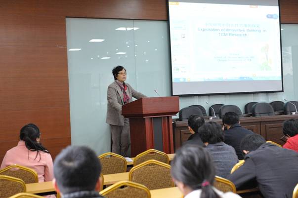 陈建萍作了题为“中医研究中创新性思维的探索”的学术报告,强调科研精神、科研要素、科研习惯,尤其是创新思维的重要性。陈建萍以在鸡血藤领域的长期研究展开阐述,从“临床-基础-产业化”到最后回归临床的思路,介绍了她率领的团队在鸡血藤治疗乳腺癌的临床应用、鸡血藤的物质基础及开发乳腺癌活性的产品和成果等方面卓有成效的工作,为师生们梳理了科研思路与方法,鼓舞了师生们对发展中医药的信心与热情。