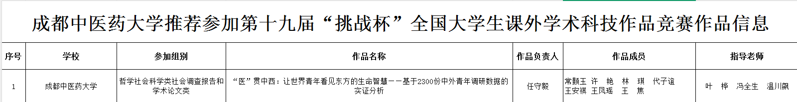 关于推荐beat365作品参加第十九届“挑战杯”全国大学生课外学术科技作品竞赛的公示 发布时间:2025-07-17 18:14:05 浏览次数: 次 【字体:小 大】 第十八届“挑战杯”四川省大学生课外学术科技作品竞赛终审决赛选拔出beat3651项优秀作品,现推荐该作品参加第十九届“挑战杯”全国大学生课外学术科技作品竞赛,详细信息如下:公示时间:2025年7月17日-21日如有异议者,请实名向校团委反映。地点:百会堂207办公室联系人:林婧电话:028-82623909共青团beat365在线唯一官网委员会2025年7月17日 【打印正文】 上一条:火热开启 | 第四届全国说医解药科普大赛(四川分赛区) 等您来战! 下一条:关于公布beat365在线唯一官网2025年公开选调面试资格审查入围人员名单的通知