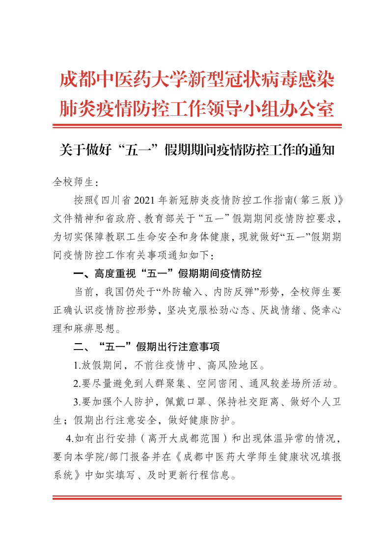 关于做好“五一”假期期间疫情防控工作的通知 发布时间:2021-04-30 11:39:26 浏览次数: 次 【字体:小 大】 【打印正文】 上一条:关于切实做好疫情防控工作的通知 下一条:关于实行夏季作息时间的通知