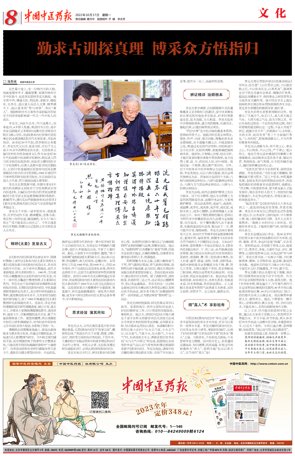 李克光于中医一途学验俱丰,成就斐然,百岁仍动作不衰,精神矍铄,思维不滞,常在网上纹枰论道,屡战屡胜,实令人“高山仰止”“虽不能至而心向往之”。今年正逢恩师百岁期颐,特撰文以记恩师之学术特色及人生风采。