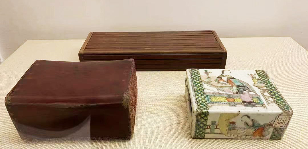 beat365在线唯一官网博物馆收藏的清代漆皮脉枕(前左)、木质脉枕(后)、民国粉彩人物瓷脉枕(前右)。
