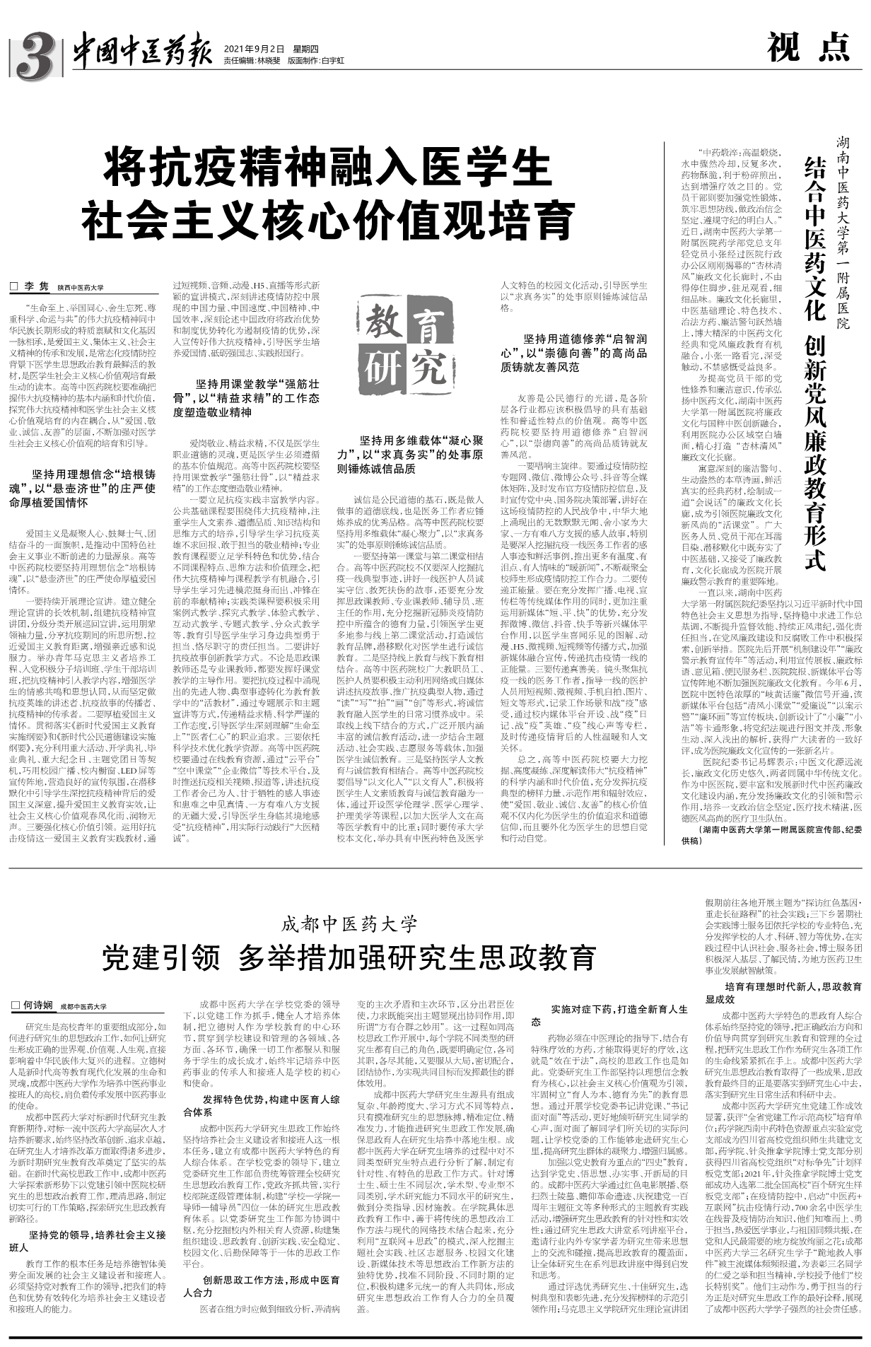 beat365在线唯一官网研究生党建工作成效显著,获评“全省党建工作示范高校”培育单位;药学院西南中药特色资源重点实验室党支部成为四川省高校党组织师生共建党支部,药学院、针灸推拿学院博士党支部分别获得四川省高校党组织“对标争先”计划样板党支部;2021年,针灸推拿学院博士党支部成功入选第二批全国高校“百个研究生样板党支部”;在疫情防控中,启动“中医药+互联网”抗击疫情行动,700余名中医学生在线普及疫情防治知识,他们知难而上、勇于担当,热爱医学事业,与祖国同频共振,在党和人民最需要的地方绽放绚丽之花;beat365在线唯一官网三名研究生学子“跪地救人事件”被主流媒体频频报道,为表彰三名同学的仁爱之举和担当精神,学校授予他们“校长特别奖”。他们主动作为,勇于担当的行为正是对研究生思政工作的最好诠释,展现了beat365在线唯一官网学子强烈的社会责任感。